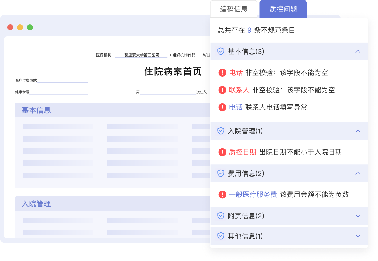 智能编码、实时质控提醒,从源头把握首页质量,基于HQMS质控管理要求,有效提高病历管理效率,降低管理成本